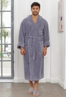 Длинный теплый мужской домашний халат прямого силуэта, с запахом. Ворс халата лёгкий и приятный на ощупь.Рукава халата широкие, прямые, с отворотами по низу, втачиваются в открытую пройму. Полочки халата с крупными накладными карманами. На середину горловину спинки с изнаночной стороны настрочена фирменная жаккардовая лента, выполняющая роль вешалки. Горловина халата обработана широким воротником шалью. Функцию застёжки халата выполняет обтачной пояс, продёрнутый в шлёвки по боковым швам.